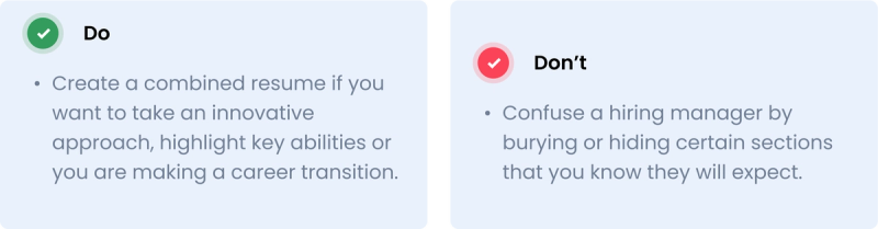 A combined format sometimes called a combination format, is exactly what it sounds like: the perfect fusion of the chronological and functional formats. The need for a combined resume format is often dictated by the candidate’s job search. For example, a freelancer looking to apply to a full-time position may want to begin the resume with top skills before following up with an Employment History section to show their ability to work in environments similar to the prospective employer’s.