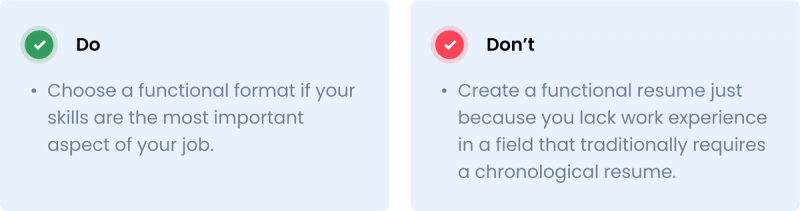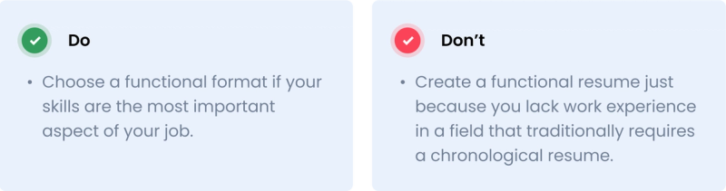 Since a functional resume format is more flexible than a chronological one, it’s a great choice for a variety of job situations. Skilled tradespeople, freelancers, gig workers, students, and even recent grads can all benefit from highlighting their strengths without having to categorically organize them under previous positions which may be too numerous or repetitive.